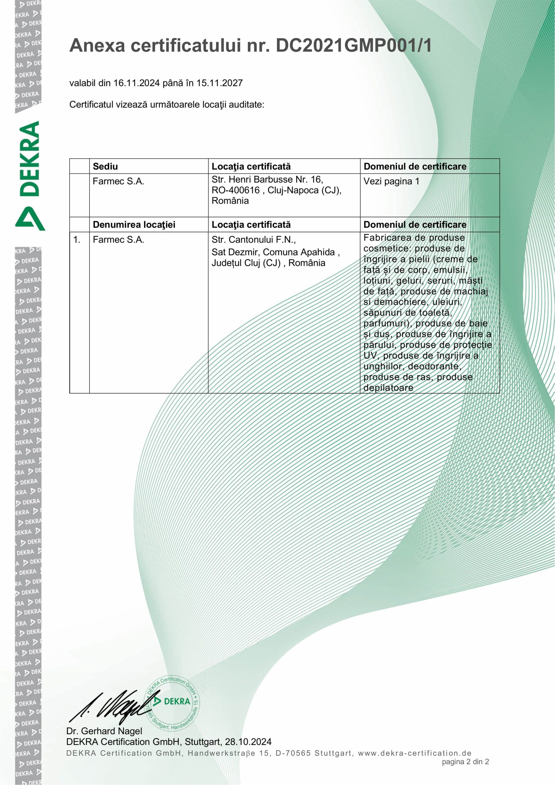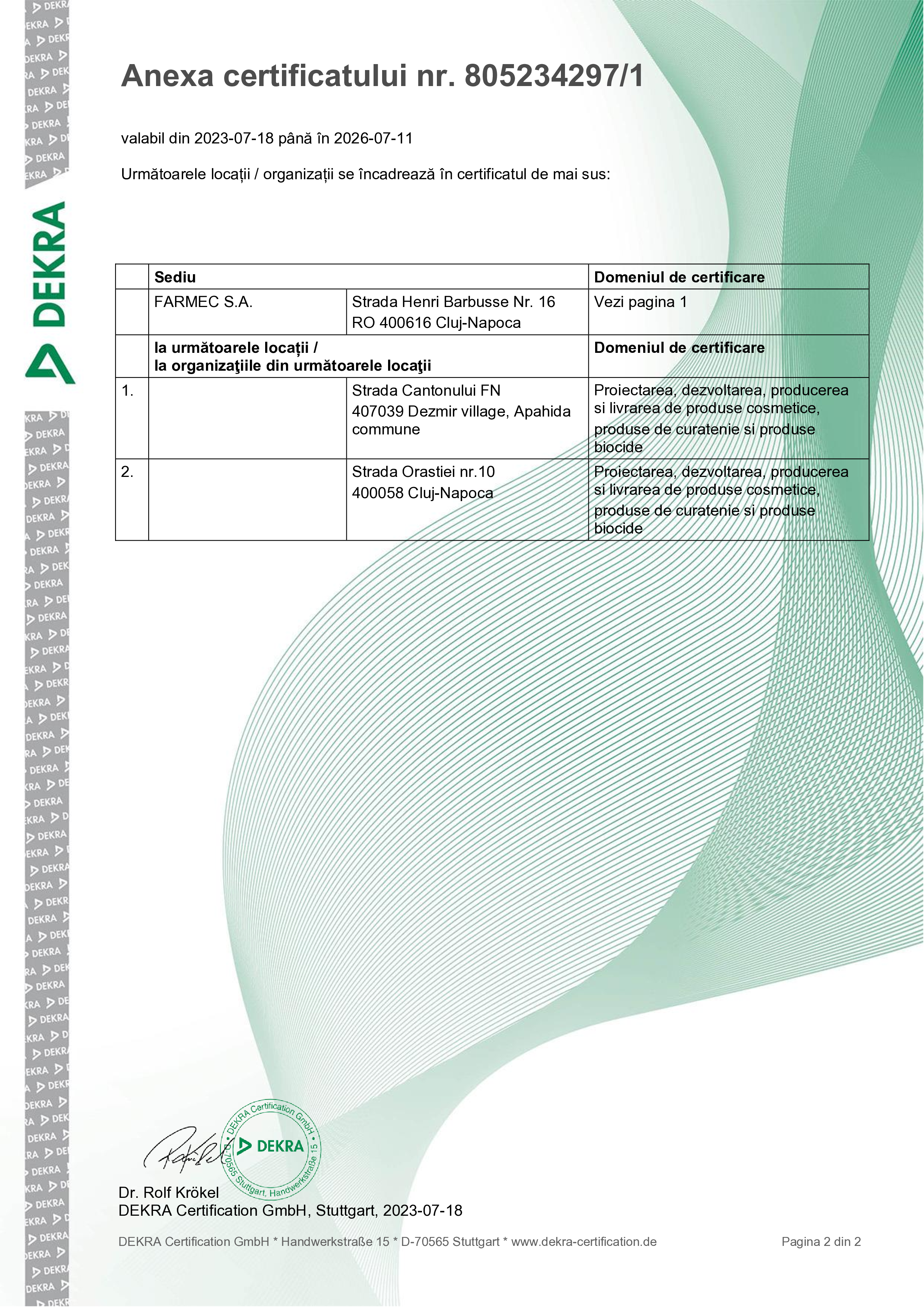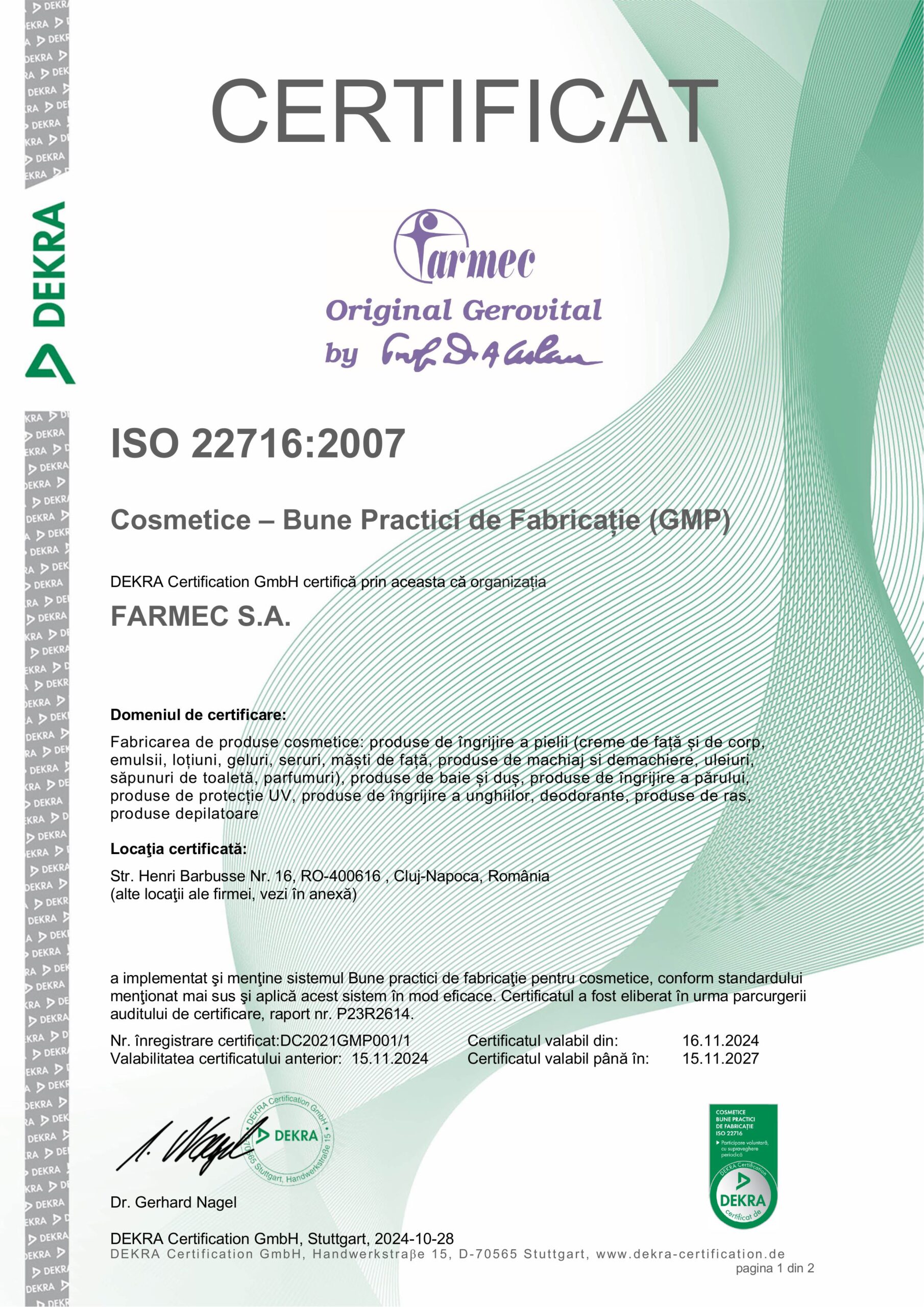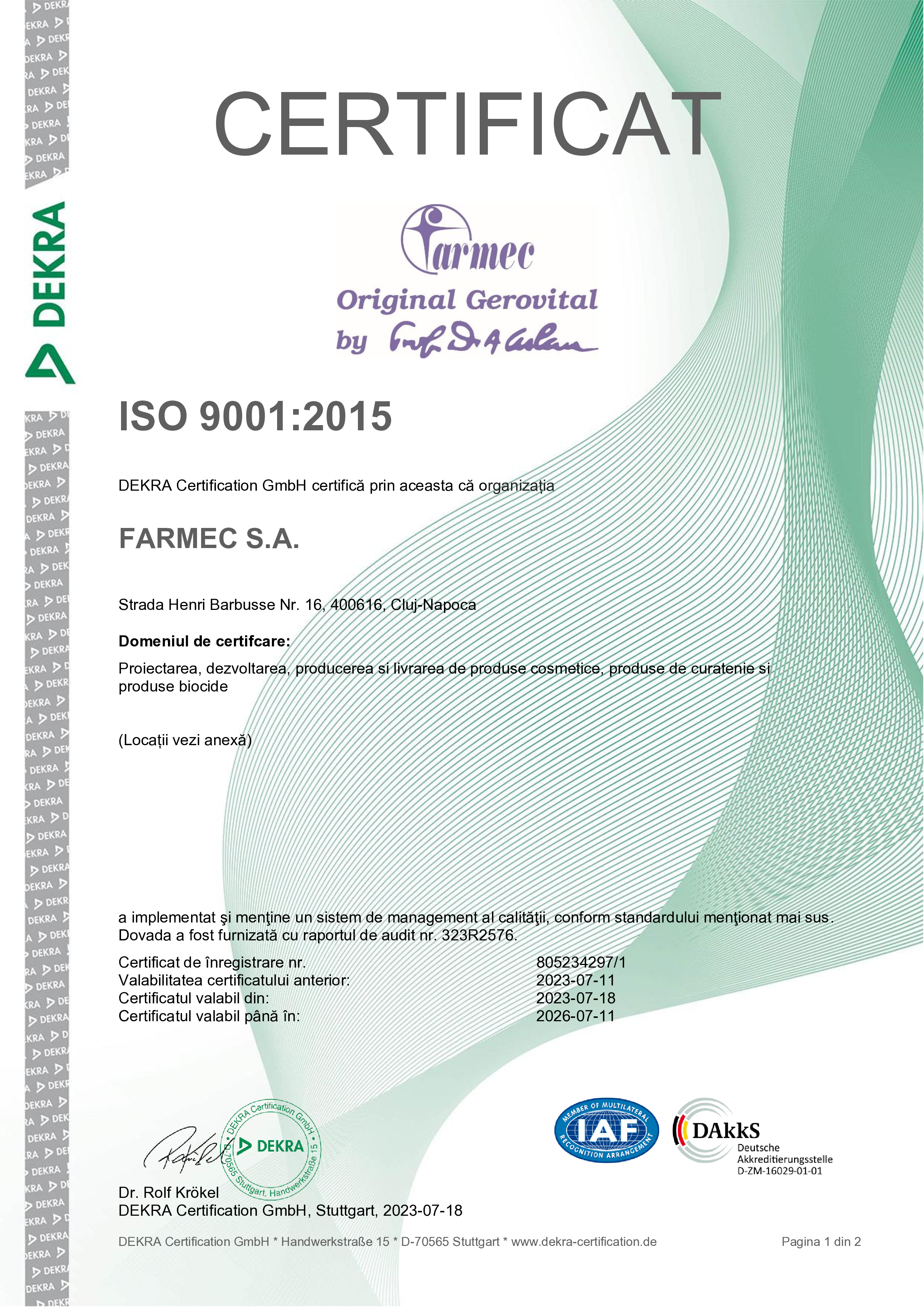 Pentru că dorește să ofere clienților garanția unor produse de cea mai bună calitate, FARMEC SA Cluj-Napoca a implementat atât Sisteme de Management al Calității și Mediului, cât și GMP (Bune Practici de Fabricație a Cosmeticelor) și a obținut certificări și recertificări ale acestora în conformitate cu cerințele standardelor ISO 9001 (începând cu anul 2002), ISO 14001 (începând cu anul 2011) și ISO 22716 (începând cu anul 2012).
