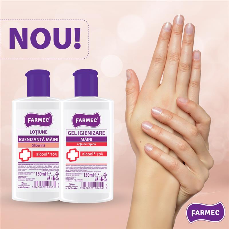 Farmec, cel mai mare producător român de cosmetice, începe de astăzi producția a două noi produse igienizante pentru uz personal, pe bază de alcool 70%: Loțiunea igienizantă pentru mâini și Gelul de igienizare pentru mâini. Produsele acționează rapid, fiind o măsură practică şi eficientă pentru apărarea sănătății. Acestea vin în completarea portofoliului actual, care cuprinde alte două tipuri de produse pentru igiena mâinilor și a suprafețelor: Săpun Lichid Spumă Antibacterian Gerovital Pure și Nufăr Dezinfectant Universal.