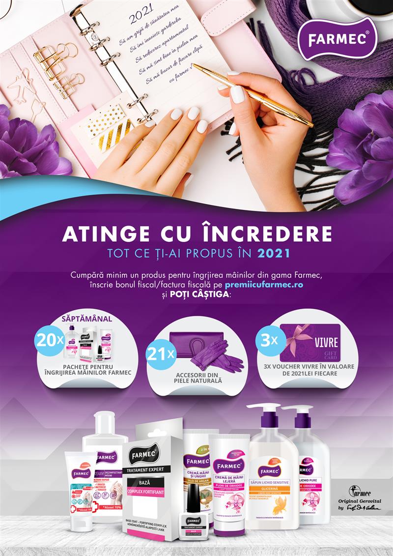 , Confort oferit de produsele Farmec aflate în promoție este completat de conceptul premiilor gândite să contribuie la succesul planurilor personale din noul an. Astfel, în perioada 20 ianuarie – 20 februarie 2021, consumatorii care achiziționează minim un produs pentru îngrijirea mâinilor Farmec și înscriu bonul pe platforma www.premiicufarmec.ro pot câștiga unul dintre cele trei categorii de premii din cadrul campaniei: 20 de kit-uri pentru îngrijirea mâinilor, însemnând un set complet de produse pentru igiena și frumusețea pielii și a unghiilor; 21 de seturi de accesorii din piele naturală formate dintr-un portofel și o pereche de mănuși sau 3 vouchere pentru cumpărături în valoare de 2021 lei la magazinul românesc de mobilă Vivre.