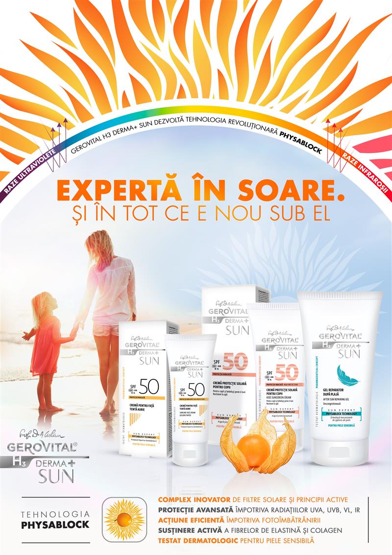 Cu un portofoliu de 7 produse, linia Gerovital H3 Derma+ Sun se adresează atât copiilor, cât și adulților, având formulări ușoare cu o toleranță cutanată foarte bună, fără ingrediente sensibilizante, testate sub control dermatologic pe persoanele cu piele sensibilă.