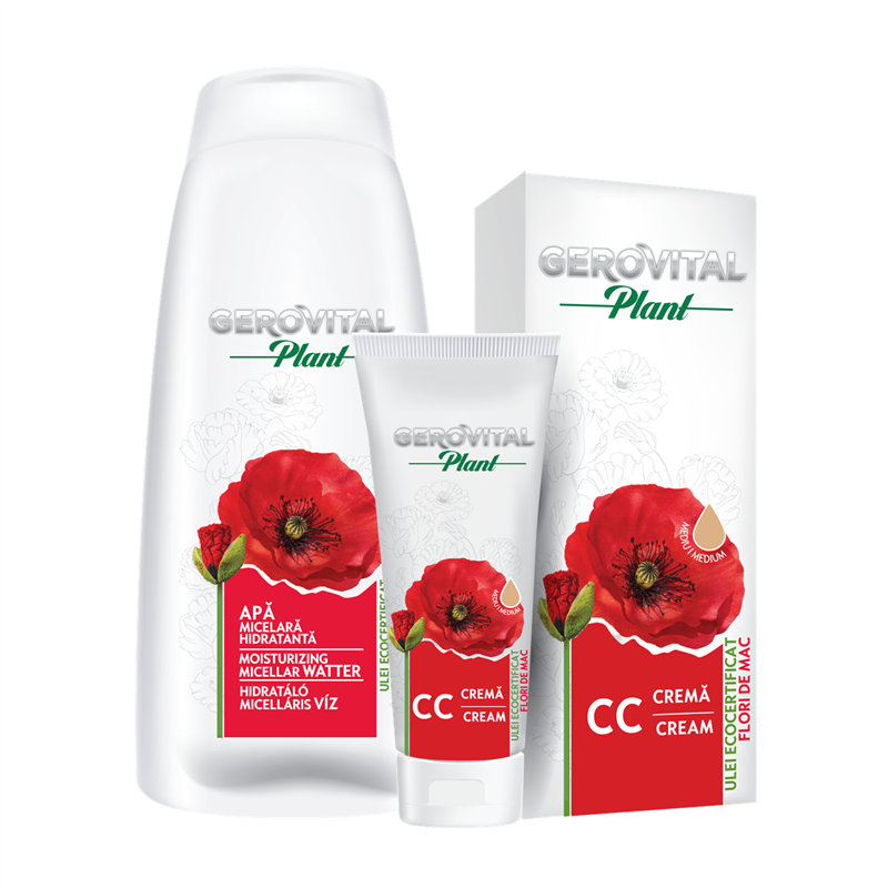 Apa micelară hidratantă la gramaj de 400 ml şi Crema CC Mediu, produsele cel mai recent intrate în gama Gerovital Plant, sunt bogate în ingrediente active, naturale, cu un rol esenţial în refacerea şi hrănirea pielii. Ambele au la bază uleiul ecocertificat din flori de mac, extrem de eficient în tratamentul cosmetic al tenurilor sensibile şi expuse stresului factorilor de mediu. Acesta previne deshidratarea, apariţia ridurilor şi îmbătrânirea prematură a dermei, fiind recomandat persoanelor între 20-35 ani.