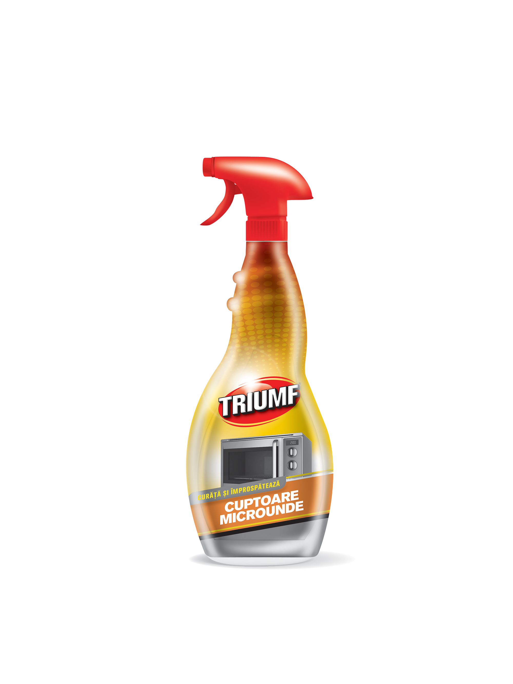 Solutia Triumf Cuptoare Microunde este eficienta in eliminarea reziduurilor rezultate din evaporare, stropi, resturile de mancare. Pentru murdaria persistenta, lasati produsul sa actioneze mai mult timp sau repetati operatia.