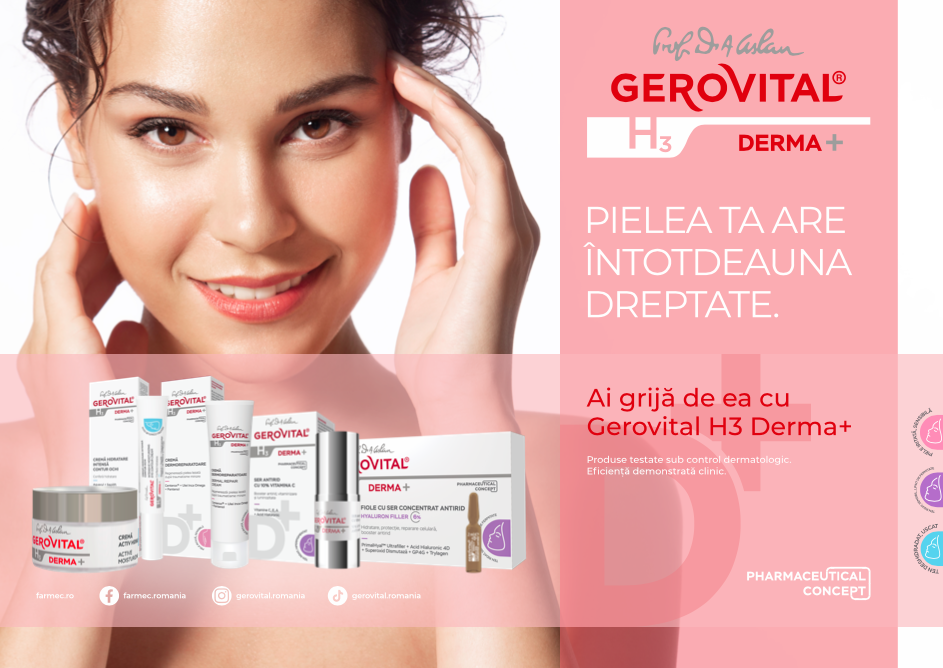 Relansarea gamei de produse dermato-cosmetice Gerovital H3 Derma+, cu o nouă imagine și sub scheme de tratament complexe, potrivite pentru diverse afecțiuni ale pielii.