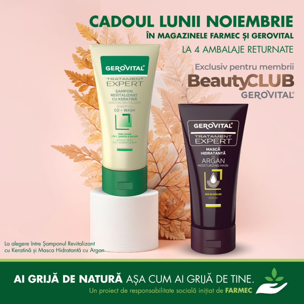 În luna noiembrie, cadoul este la alegere dintre Șamponul Revitalizant cu Keratină sau Mască Hidratantă cu Argan și Ulei de Măsline.