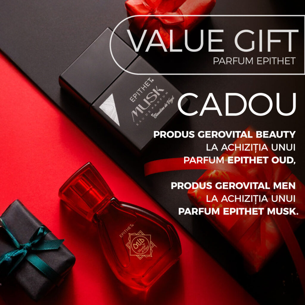 La achiziția unui parfum EPITHET OUD primești CADOU un produs Gerovital Beauty, iar la achiziția unui parfum EPITHT MUSK primești CADOU un produs Gerovital Men.