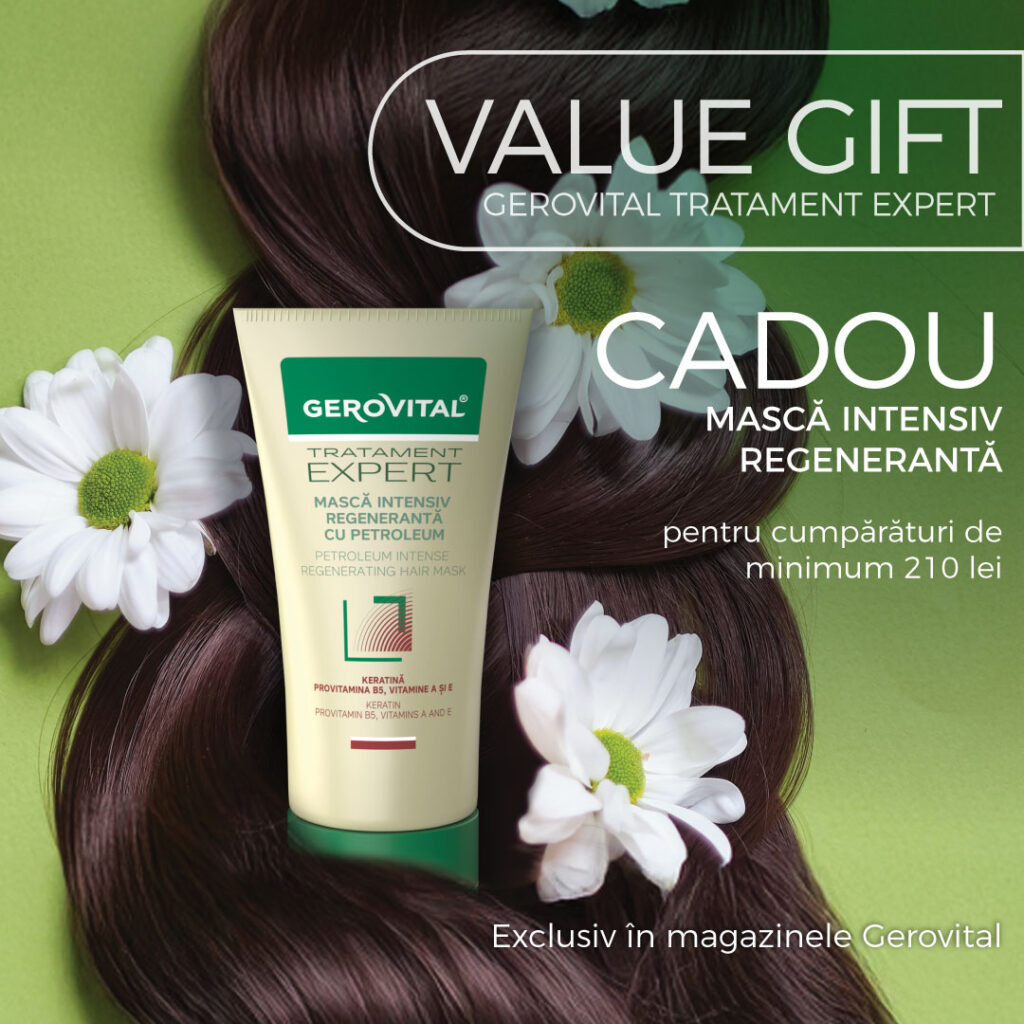 Cumpără produse de minimum 210 RON și primești CADOU o mască intensiv regenerantă de la Gerovital Tratament Expert. Această ofertă nu se aplică produselor aflate în alte promoții.