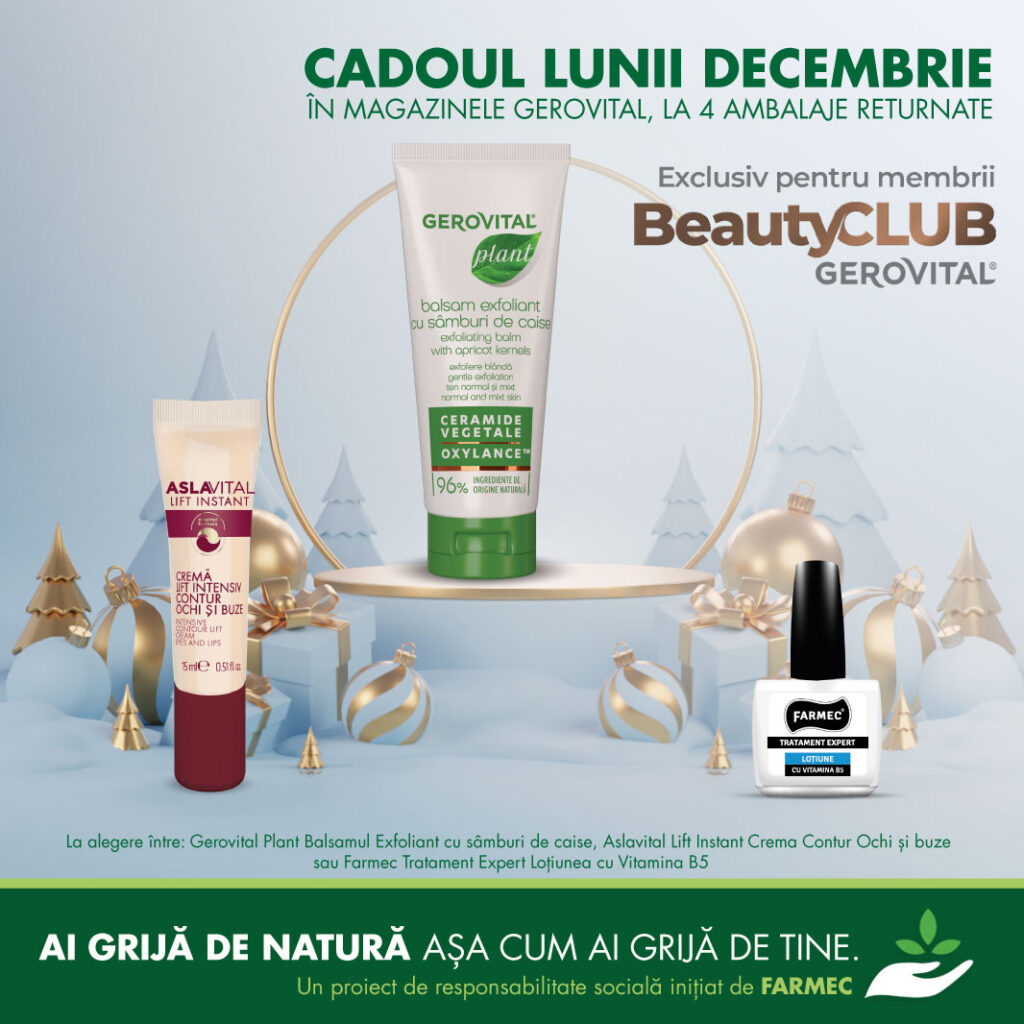În luna decembrie, cadoul este la alegere dintre Cremă Lift Intensiv Contur – ochi şi buze Aslavital Lift Instant sau Balsam Exfoliant cu Niacinamidă și Sâmburi de Caise pentru Ten Normal și Mixt Gerovital Plant sau Tratament Expert – Loţiune cu Vitamina B5