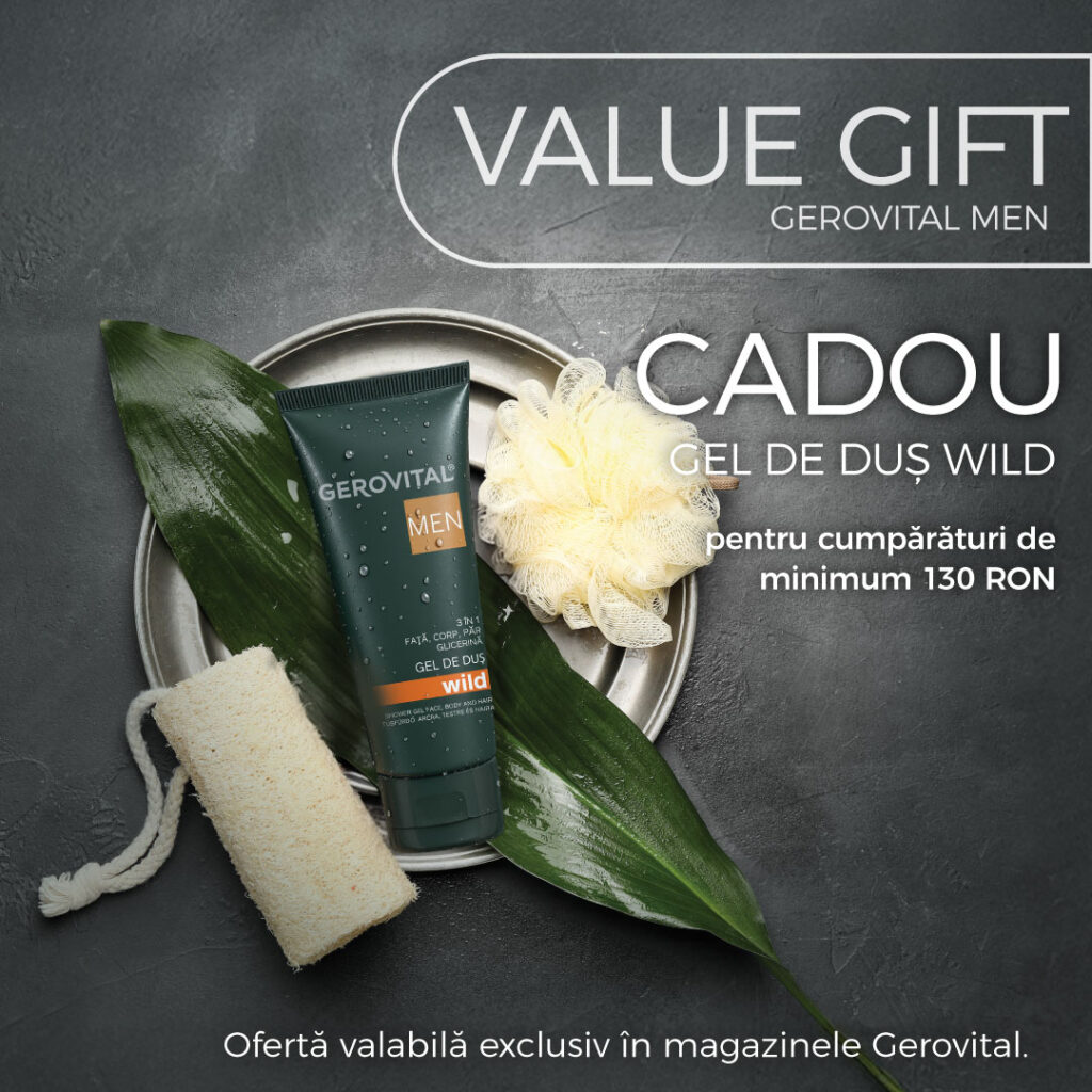 Cumpără de minimUM 130 RON și primești CADOU un gel de duș Wild Gerovital Men.