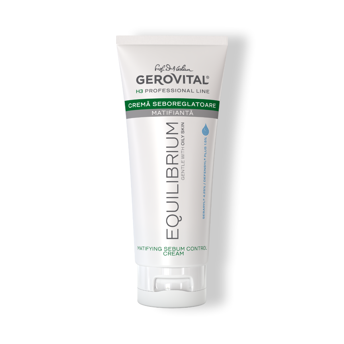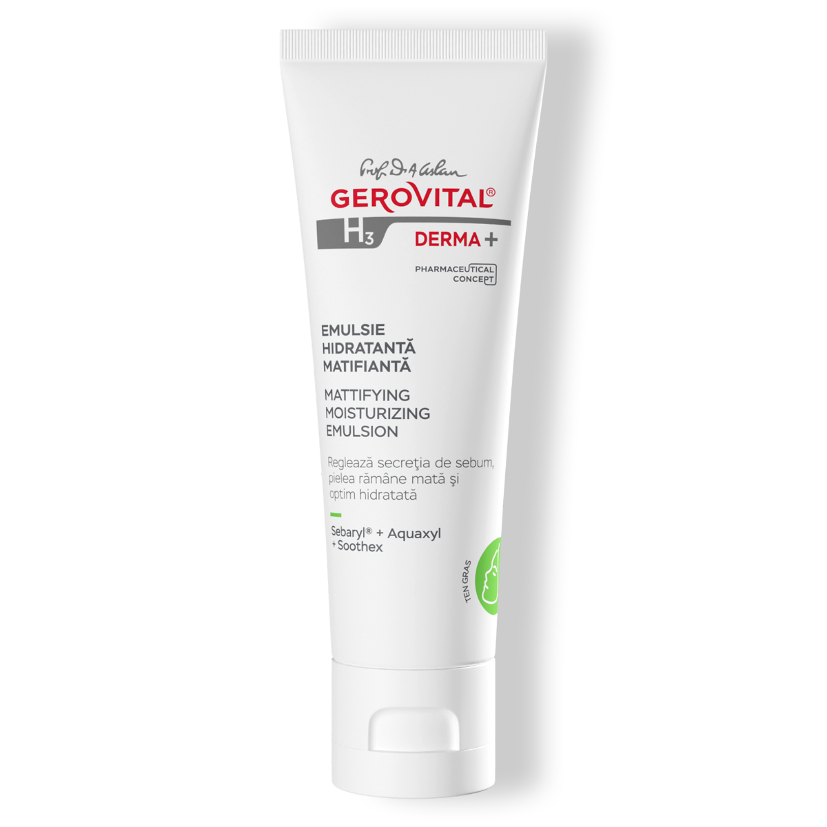 Aplicati dimineata si seara, pe tenul curat, Emulsia Hidratanta Matifianta Derma+, in a carei compozitie a fost inclus Sebaryl-ul, cu rol de a regla secretia de sebum si Aquaxyl-ul, un ingredient hidratant de exceptie. O data pe saptamana, aplicati Masca Reparatoare Gerovital H3 Equilibrium. Produsul elimina toxinele, celulele moarte, excesul de sebum, praful si impuritatile de la suprafata pielii, inchide porii dilatati caracteristici tenului mixt si gras.
